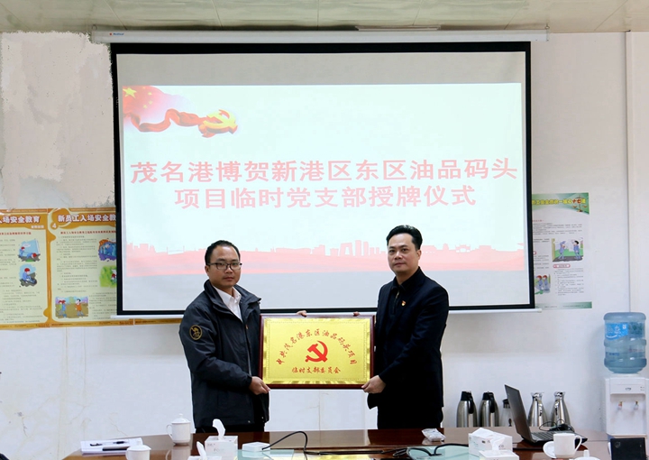 12月18日上午,茂名港集團牽頭舉行博賀新港區(qū)東區(qū)油品碼頭項目工程臨時黨支部授牌儀式,集團黨委副書記、工會主席肖炳璋為臨時黨支部授牌。臨時黨支部書記梁祖釗作表態(tài)發(fā)言并鄭重作出承諾。
