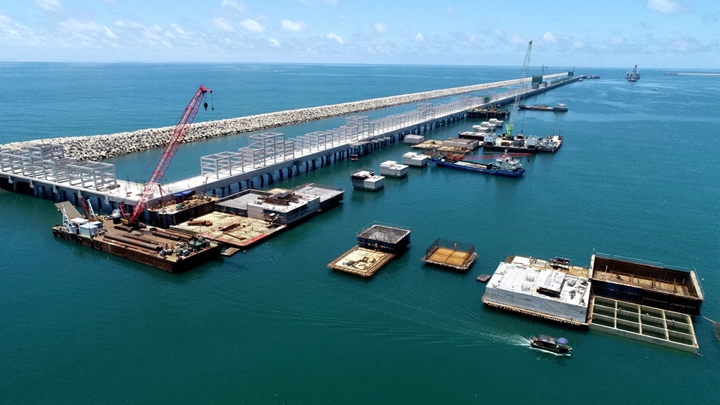 3×5萬噸級油氣化工碼頭項目港池疏浚已完成,沉箱預(yù)制完成86%、安裝完成54%,胸墻澆筑完成26%,項目總體進(jìn)度完成63%;