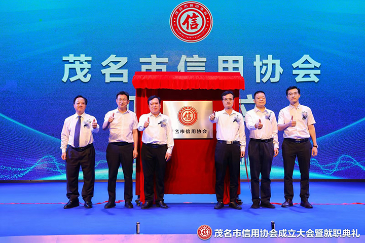茂名市人大常委會副主任吳海強(右三),茂名市政協(xié)黨組副書記、副主席楊培基(左三),茂名市人民政府副秘書長何江(右二),茂名市發(fā)展和改革局黨組書記、局長朱春保(左二 ),廣東省發(fā)展改革委信用建設(shè)處一級主任科員譚強杰(右一),茂名市信用協(xié)會會長李文(左一)共同為茂名市信用協(xié)會揭牌。