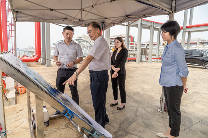 8月17日下午,粵港澳大灣區(qū)供應(yīng)鏈研究院執(zhí)行院長(zhǎng)邱國(guó)宣一行到訪集團(tuán)調(diào)研。集團(tuán)黨委書記、董事長(zhǎng)王志華,黨委副書記、常務(wù)副總裁朱廣宇及相關(guān)負(fù)責(zé)人陪同調(diào)研交流。 邱國(guó)宣一行深入博賀新港區(qū)一線建設(shè)現(xiàn)場(chǎng),在東區(qū)油品碼頭E2泊位前,朱廣宇向客人詳細(xì)介紹了茂名港博賀新港區(qū)的項(xiàng)目規(guī)劃和項(xiàng)目建設(shè)情況。