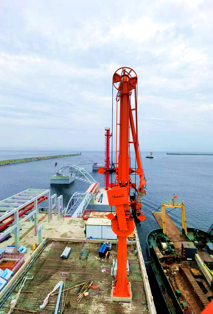 此次安裝的4臺裝卸臂堪稱碼頭“大動脈”,每臺高23.3米、重41.83噸,采用電/液驅(qū)動技術(shù),具備高效、安全、穩(wěn)定的輸油能力,全部投用后,每年可助力完成1650萬噸原油輸送任務(wù),將大幅提升茂名港原油接卸與中轉(zhuǎn)效率。同步安裝的具有浮動功能的登船梯高26.5米、重約32噸,根據(jù)潮汐自動調(diào)節(jié)梯高度的智能設(shè)計,為10萬到30萬噸級的船舶提供了安全便捷的通道;2座高29米的消防炮塔上的消防水炮最大覆蓋半徑達99米,其射程遠、流量大,如同“安全衛(wèi)士”構(gòu)筑起碼頭前沿的安全保障網(wǎng)。