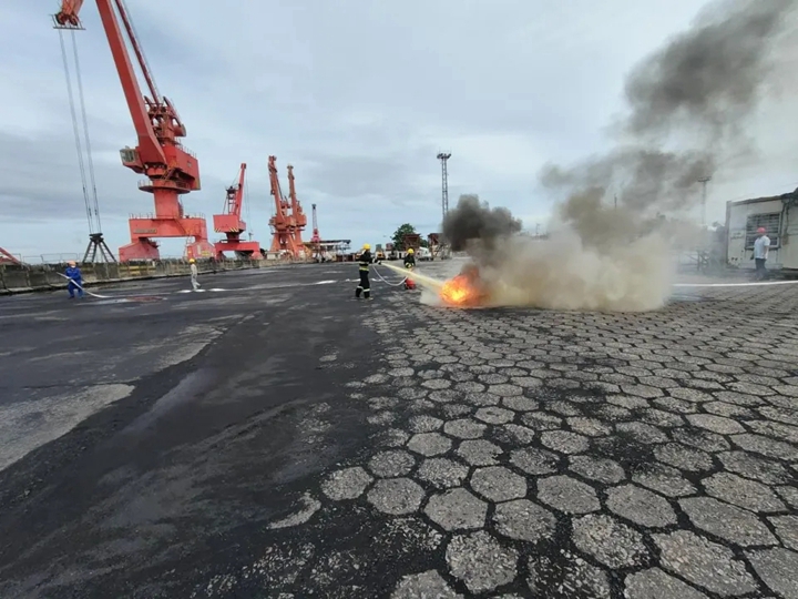 港口經(jīng)營公司開展港口設(shè)施保安暨碼頭消防綜合應(yīng)急演練,模擬裝船作業(yè),因有疑似恐怖分子從海上手持兇器強行登陸實施縱火,演練人員迅速響應(yīng),配合默契,開展消防滅火、搶險救援、港口設(shè)施保安、防海洋環(huán)境污染、醫(yī)療及后勤等應(yīng)急處理。